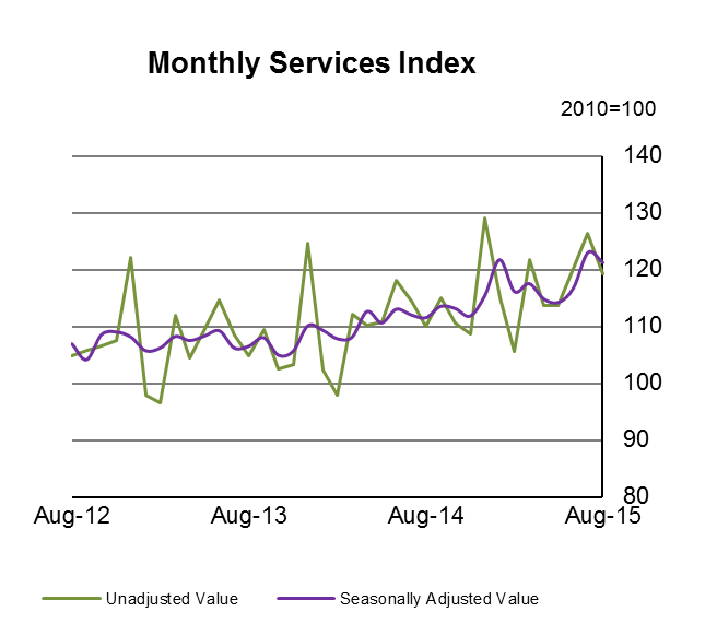 The seasonally adjusted monthly services value index decreased by 1.5 % in August 2015 when compared with July 2015 while, in the year to August 2015, there was an increase of 8.7%.