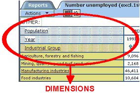 A dimension describes an attribute of the table data, e.g. Population, Industrial group or Year. See fig1 below.