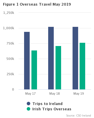 The total number of overseas trips made by Irish residents during May 2019 increased by 7.7% to 765,900. See tables 1 and 2.