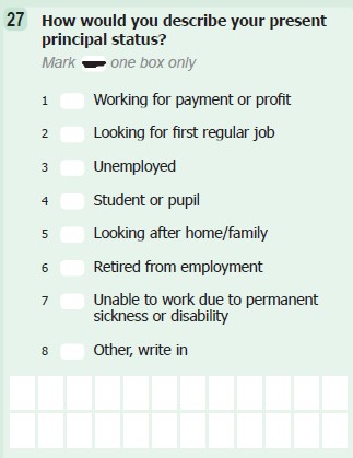 The category student covers persons aged 5 to 14 and persons aged 15 and over who indicated they were students by ticking box 4 on Question 27 on the census form which requests the person’s present principal status.