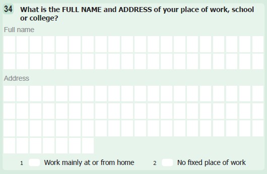 Where the person ticked box 1 or 2 on Question 34 the place of work, school or college was automatically defaulted to W/M (W=Works mainly at or from home; M=No fixed place of work). Otherwise the employer/school name and address was matched against addresses on the An Post GeoDirectory. In the case of workers, where the coder could not find an exact match they coded to a near match, if they could find a GeoDirectory address on the same street or in the same town as the address stated on the form. In the case of students, an exact match was only accepted for the school or college address. The Irish National Grid matched from the GeoDirectory were linked back to the place of work, school or college Electoral District (ED) and Town and Small Area by superimposing digital boundaries.