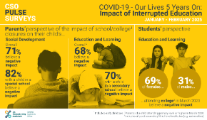 The CSO is marking five years since the emergence of COVID-19 in Ireland by publishing a number of statistical releases. Two releases will explore the social impact of COVID-19 over the last five years based on the responses to an online CSO Pulse Survey which ran from 16 January - 02 February 2025. A third release will examine the impact of COVID-19 on employment, earnings and air travel. These releases will be published during March 2025. Please refer to our CSO Release Calendar for specific dates.