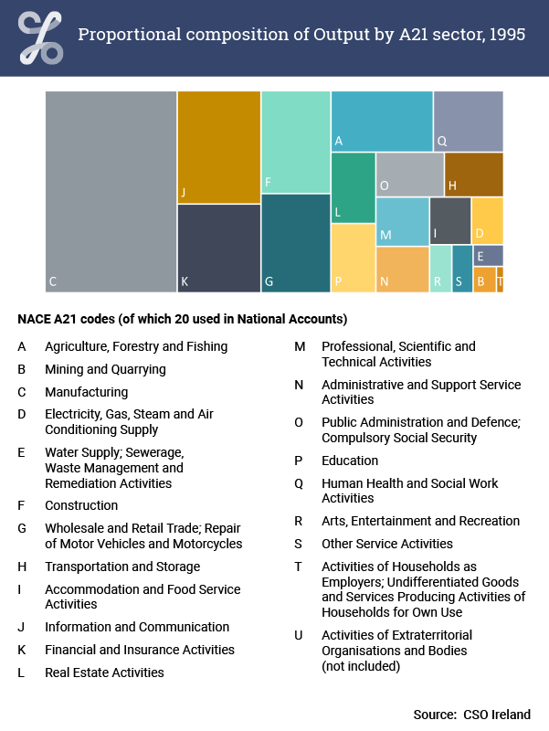 The Other category in the figure above is total Output less Manufacturing, Information and Communication and Construction. Sector figures can be found in the tables above and in the full 1995-2021 time series available in the CSO's PxStat database.