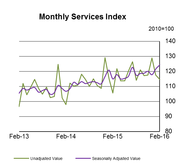 The seasonally adjusted monthly services value index increased by 2.2% in February 2016 when compared with January 2016 while, in the year to February 2016, there was an increase of 8.2%.