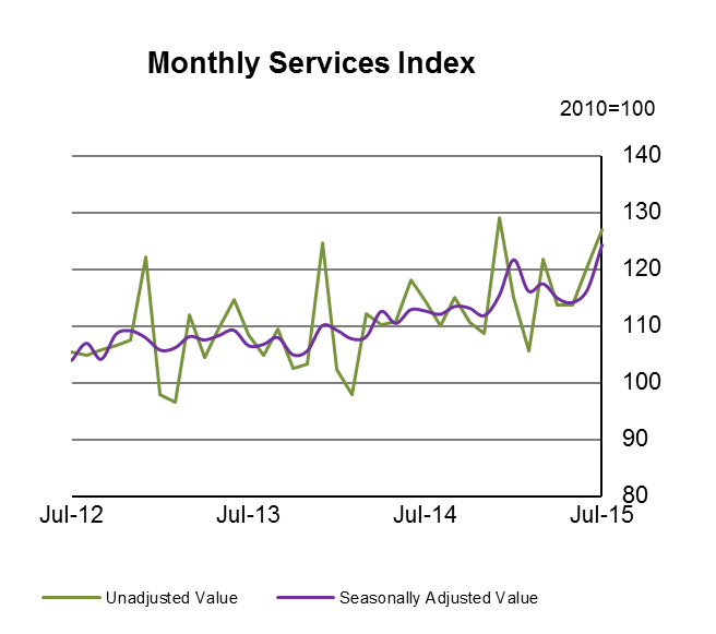 The seasonally adjusted monthly services value index increased by 6.8% in July 2015 when compared with June 2015 while, in the year to July 2015, there was an increase of 10.3%.