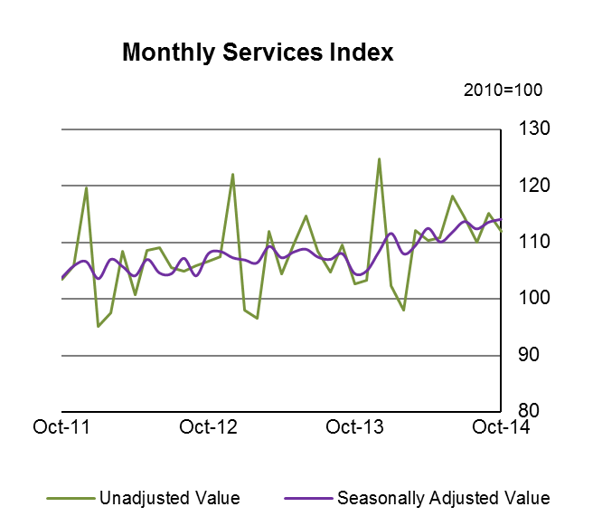 The seasonally adjusted monthly services value index increased by 0.5% in October 2014 when compared with September 2014 while, in the year to October 2014, there was an increase of 9.2%.